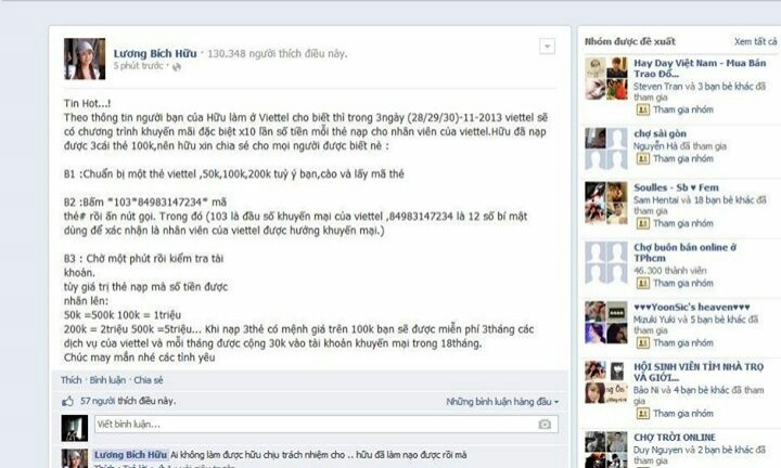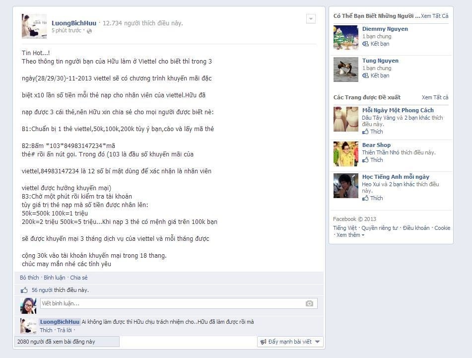 Lương Bích Hữu cho biết, trang Facebook giả mạo liên tục đăng những thông tin về cách thức nạp tiền điện thoại để được tặng tiền hoặc ngỏ ý mượn tiền khán giả bằng cách kêu gọi quyên góp tiền cho đồng bào miền Trung bị lũ lụt. Không những thế, trang còn "câu like" bằng cách hứa hẹn tặng nhiều thẻ cào điện thoại mệnh giá lớn cho những ai "like" và "share" hình ảnh của trang.