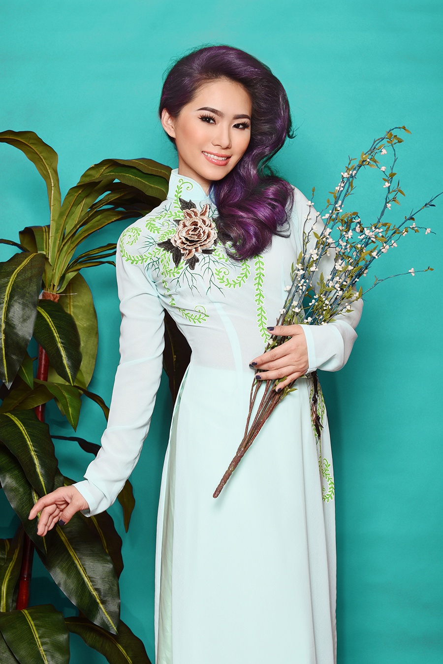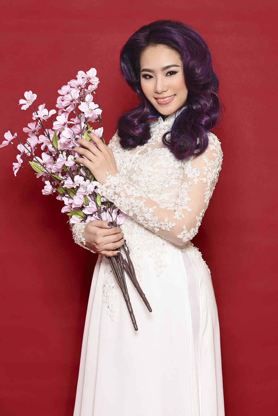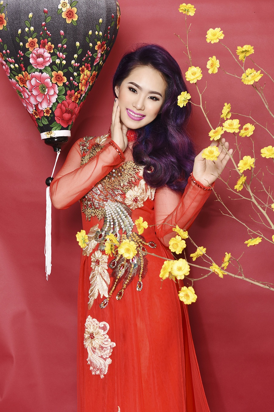 | Cũng nhân dịp Tết đến, giọng ca sinh năm 1984 làm mới phong cách với mái tóc nhuộm tím sành điệu. Phong thái tự tin, trang điểm đậm giúp bộ ảnh thêm thu hút. |