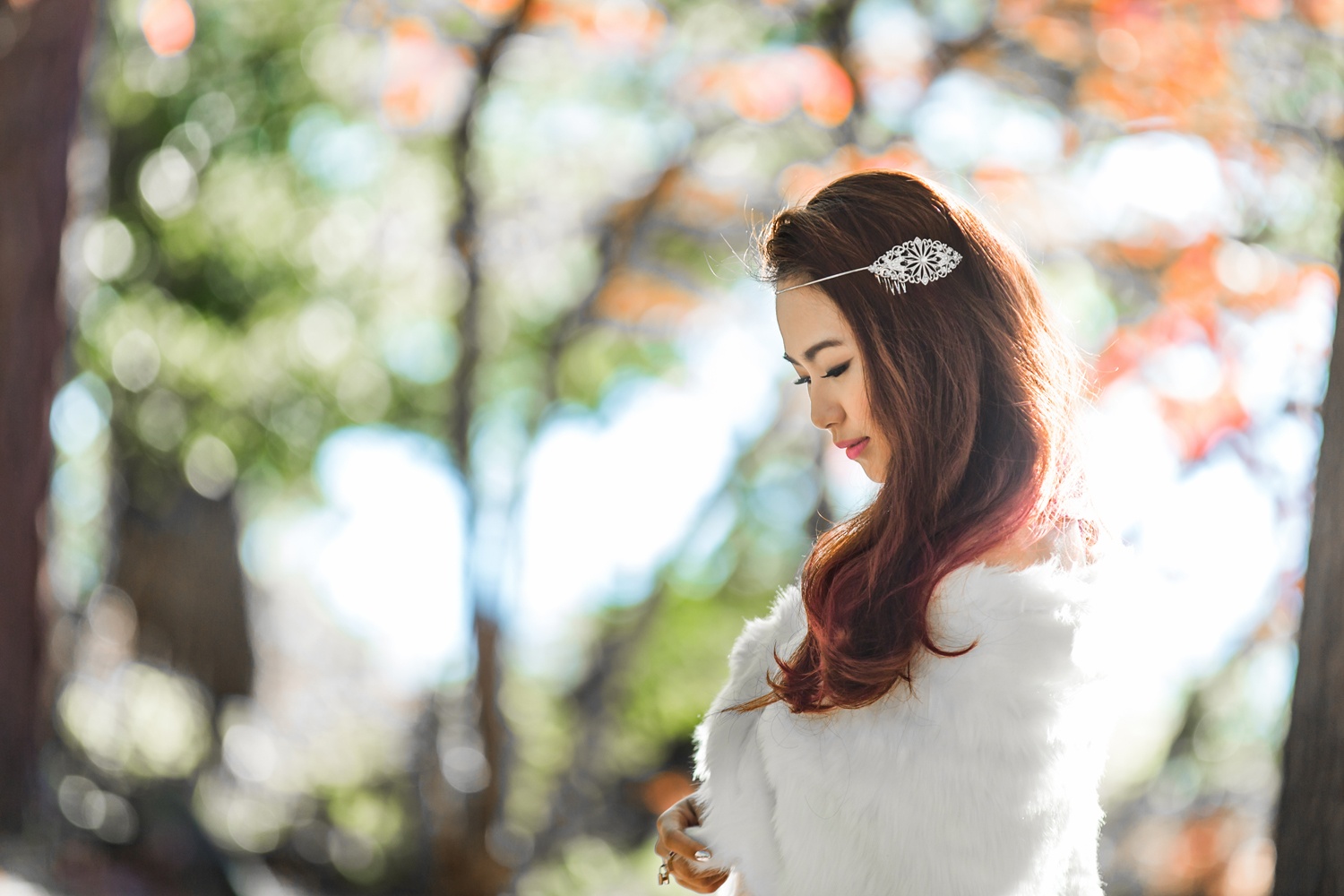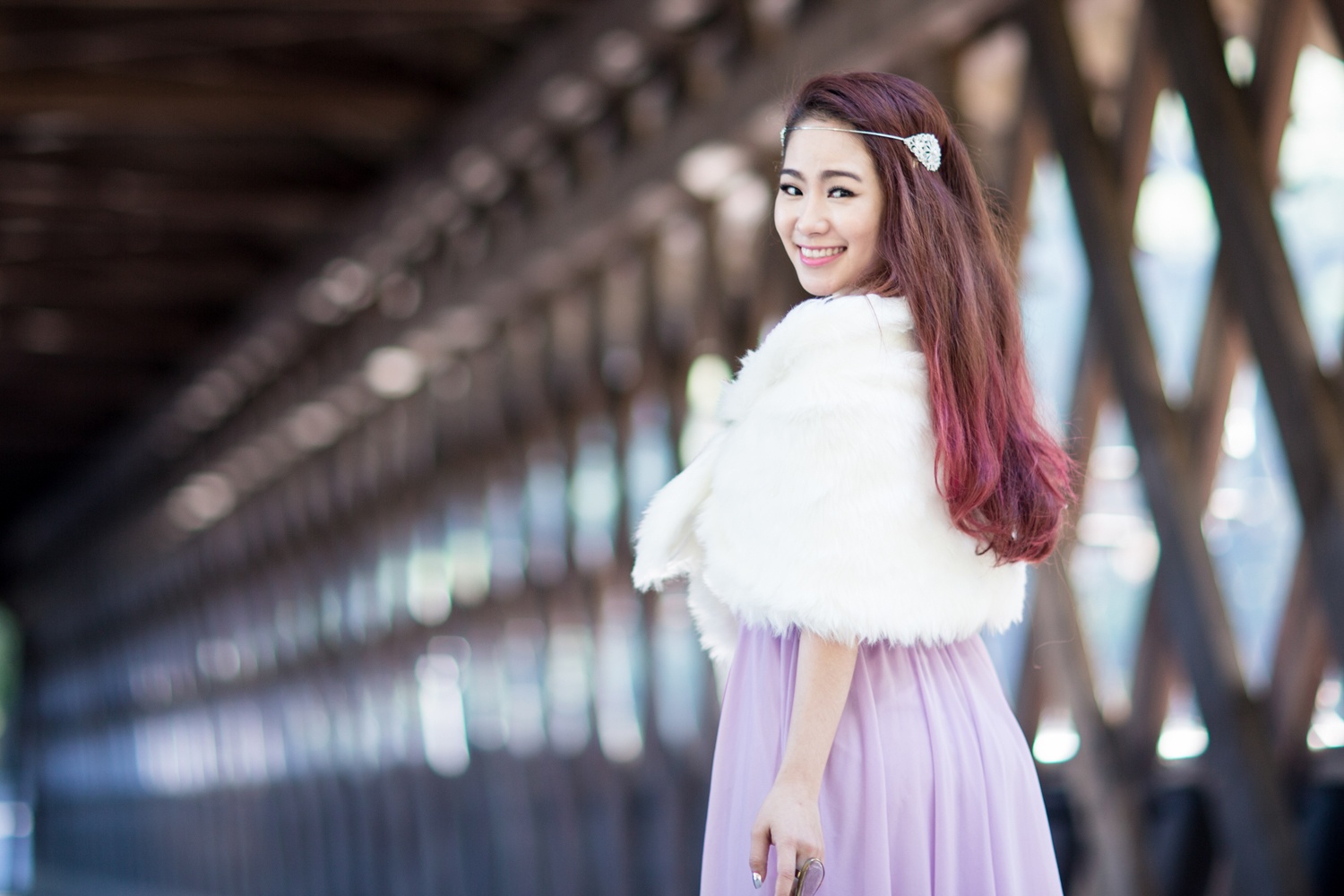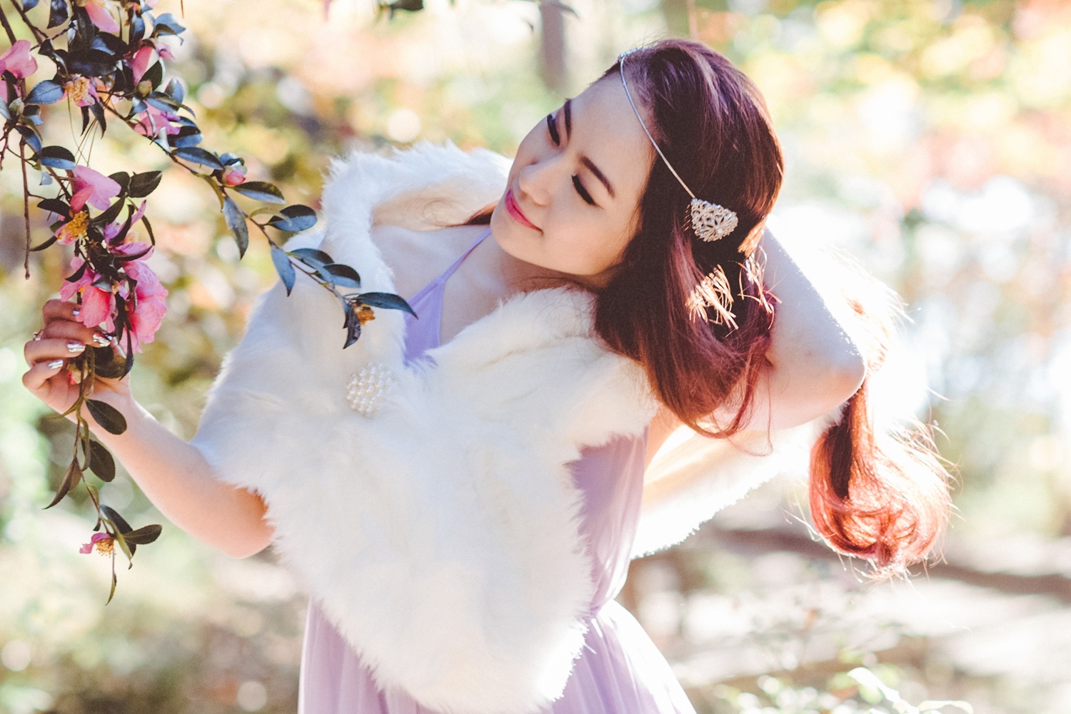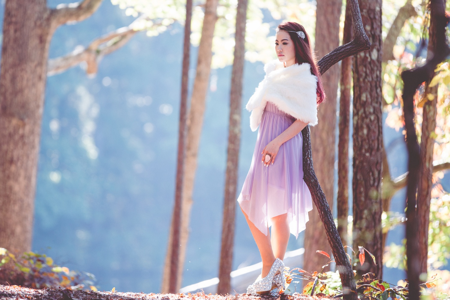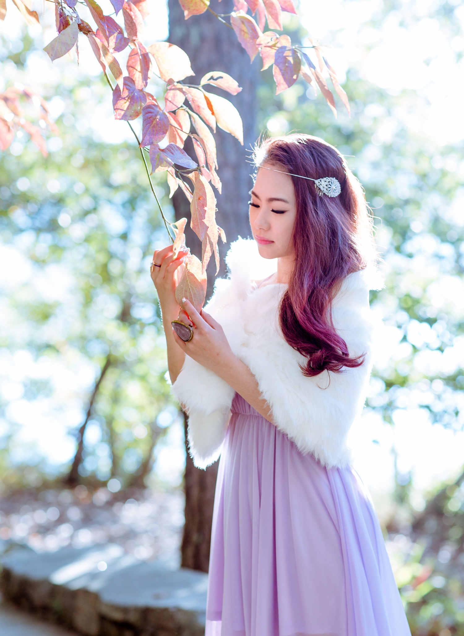 | Trong ảnh, Lương Bích Hữu diện đầm tím và choàng áo lông trong tiết trời thu. Bộ ảnh được thực hiện ở Mỹ, trước khi nữ ca sĩ về nước và tiếp tục các dự án âm nhạc. |