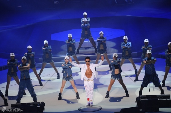 | Hiện trường càng trở nên sôi động hơn khi Lưu Đức Hoa bán nude xuất hiện trên sân khấu. |