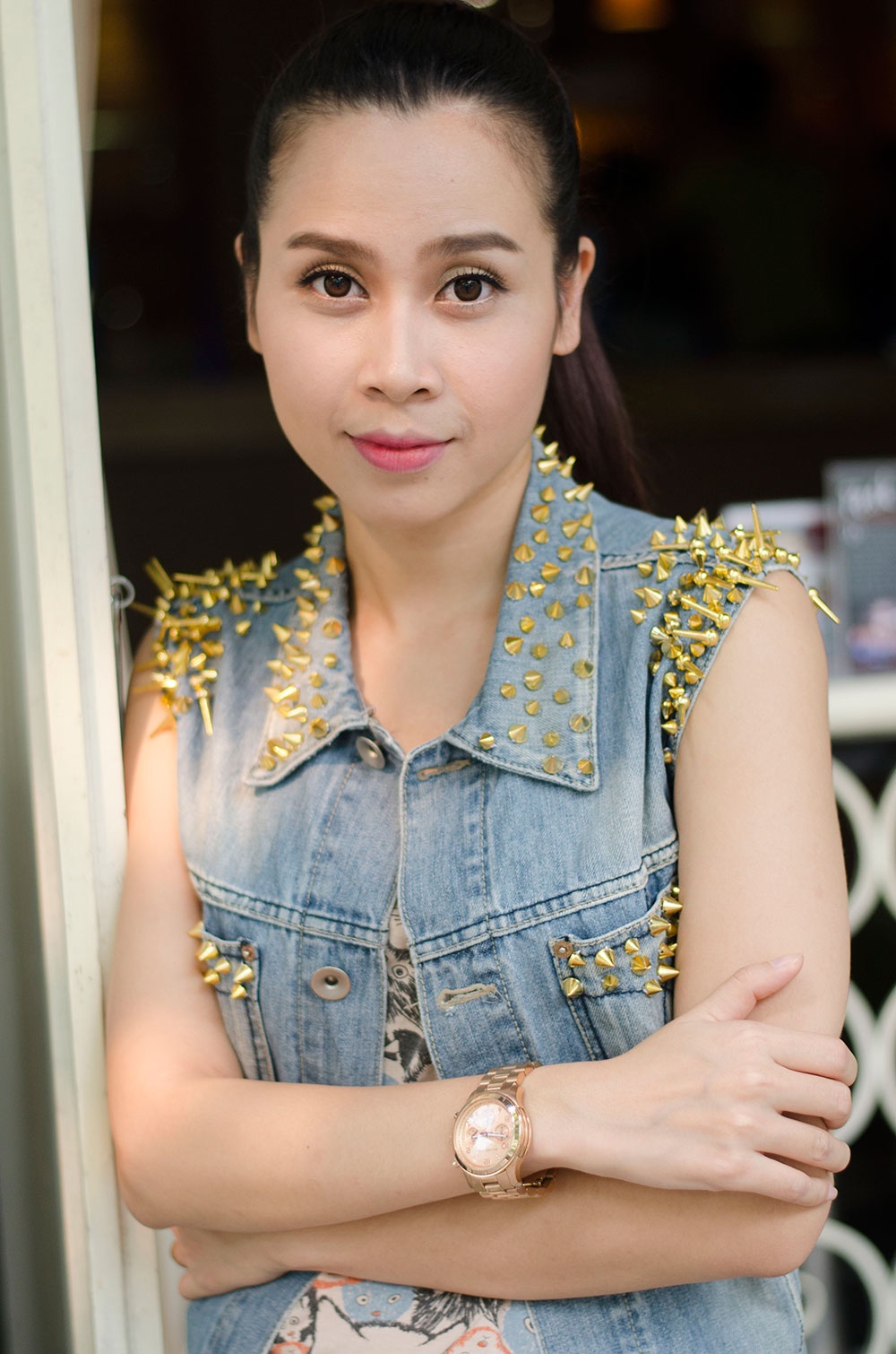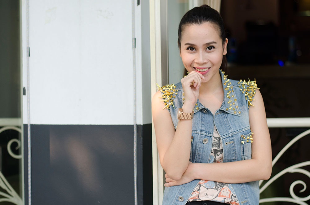 | Áo jeans bụi phủi với những chiếc đinh nhọn hợp xu hướng giúp bà mẹ một con thêm phần trẻ trung. |