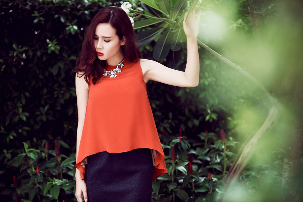 | Trong bộ ảnh mới, Lưu Hương Giang mix chân váy bút chì với áo suông đỏ cá tính. Tuy kín đáo nhưng nữ ca sĩ trông vẫn rất gợi cảm ở tuổi 31. |
