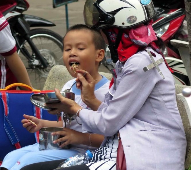 | Phụ huynh tranh thủ cho con ăn chiều trước khi dẫn vào lớp học thêm. |