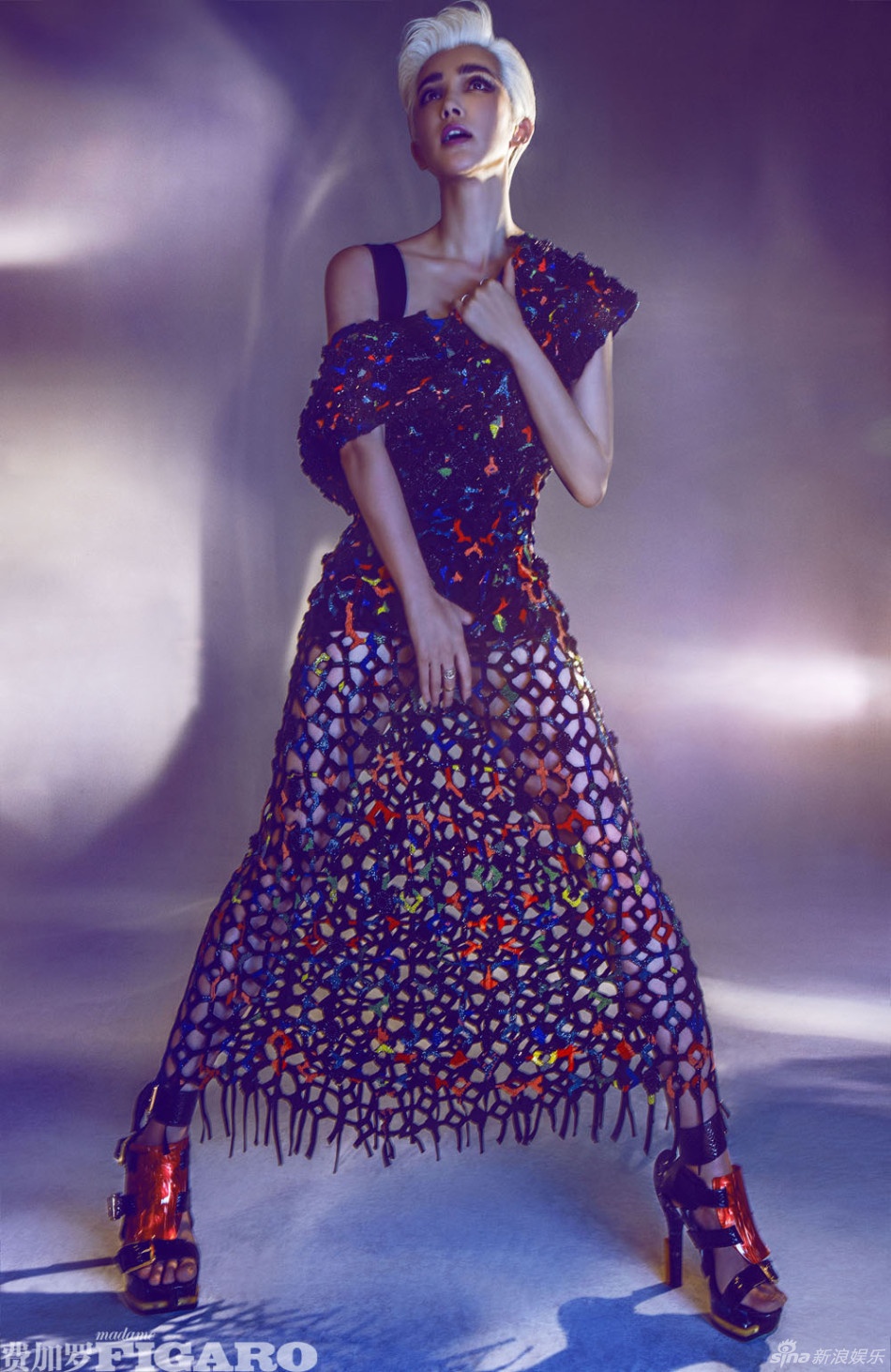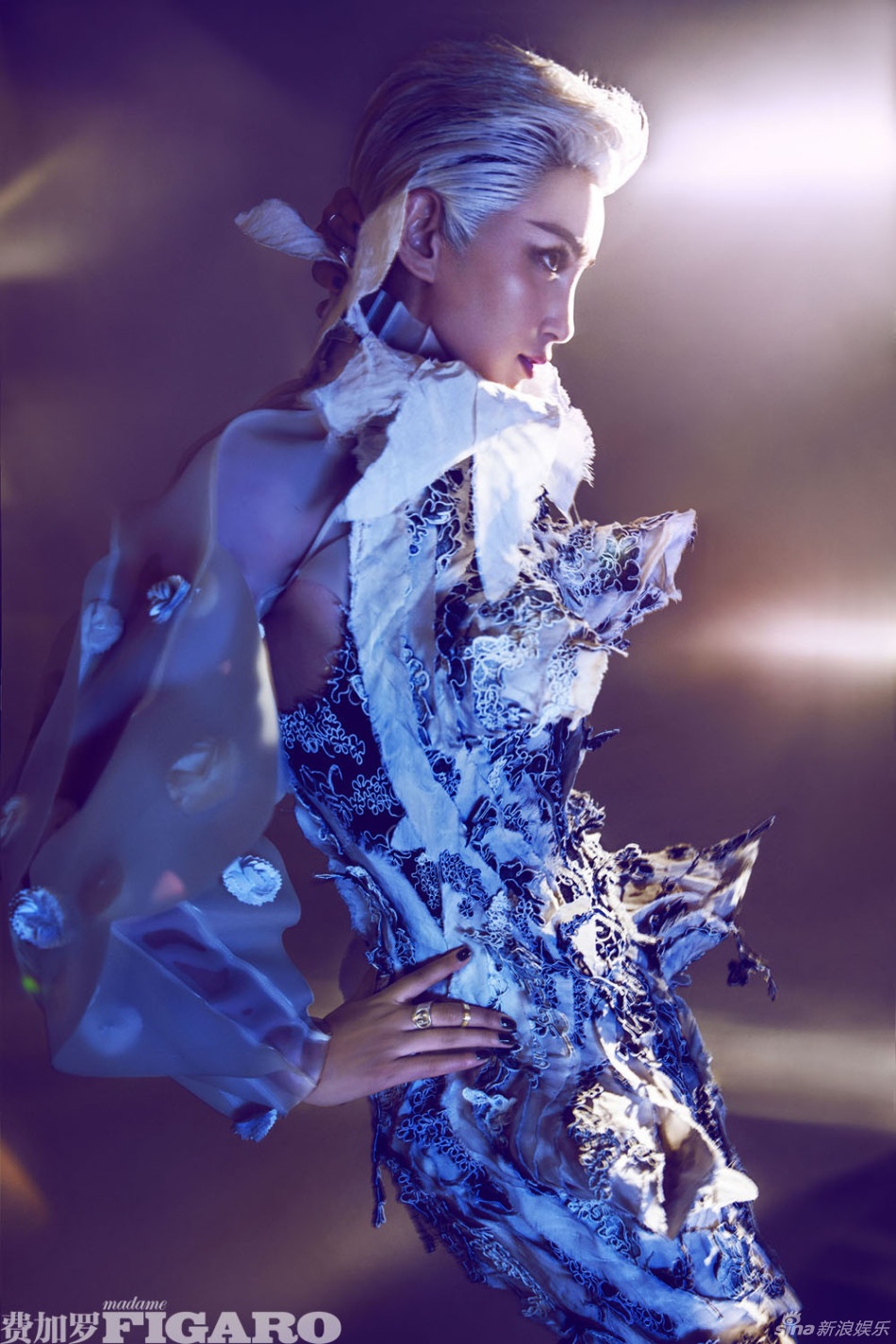 Trên tạp chí Figaro số mới nhất, Lý Băng Băng khoe trọn thân hình mảnh mai, vòng eo con kiến trong một thiết kế ôm sát có gam màu pastel tím nữ tính và dịu dàng. Phần tóc bạch kim được vuốt ngược cầu kỳ kết hợp tới gương mặt được make-up sắc nét giúp mỹ nhân họ Lý vừa xinh đẹp vừa cá tính.