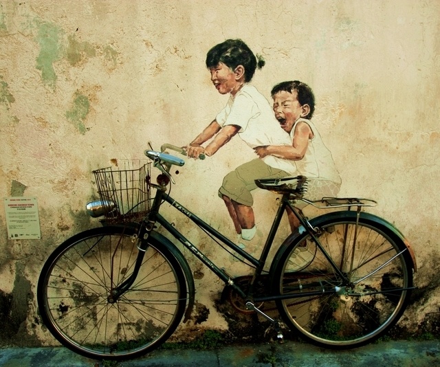 Một trong những địa chỉ nổi tiếng nhất hòn đảo là khu nghệ thuật đường phố graffiti 3D. Không phải những mảng màu nóng rẫy, nổi loạn kiểu phương Tây, những bức tranh tường graffiti 3D ở Penang nên thơ một cách Á Đông tựa như gương mặt hồn nhiên của những đứa trẻ chở nhau trên xe đạp, bé gái đu mình lơ lửng trên chiếc xích đu khổng lồ, chiếc xe đời cũ của bố hay chú mèo hoang trốn nơi góc tường đổ nát…