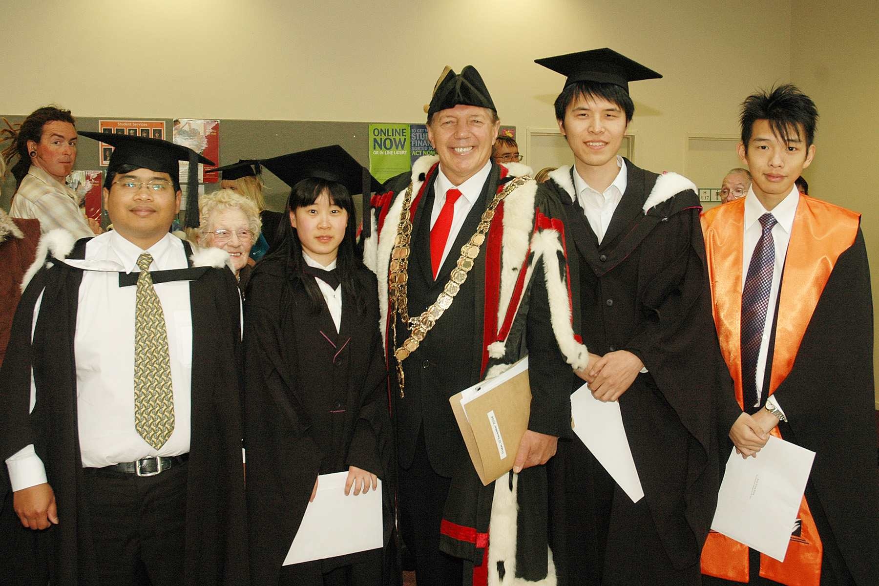| Sinh viên tốt nghiệp trường SIT chụp ảnh kỷ niệm cùng ông Tim Shadbolt - Thị trưởng thành phố Invercargill, New Zealand. |
