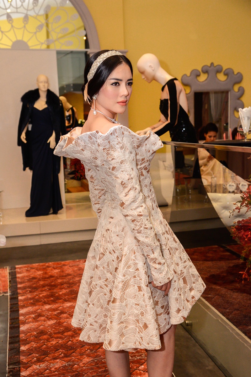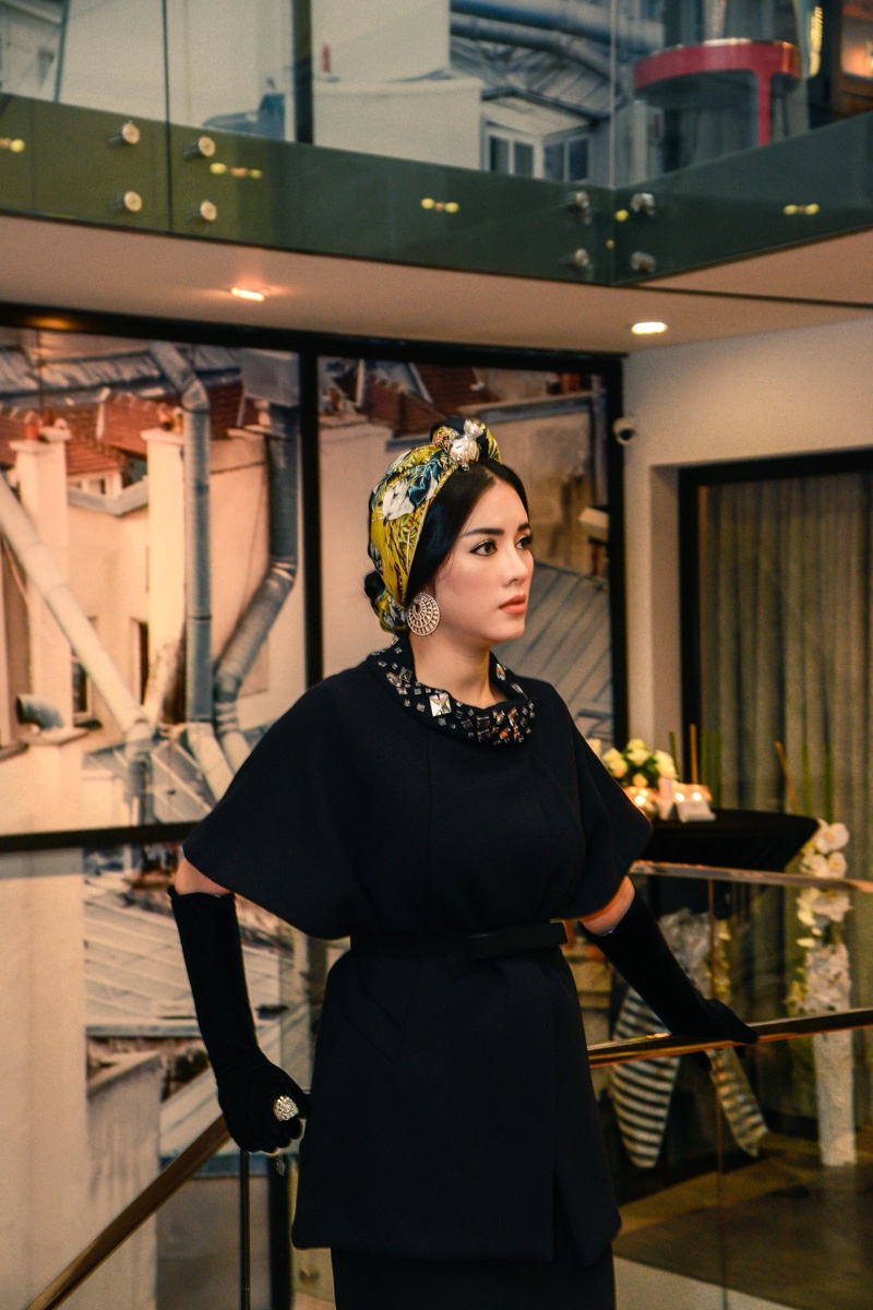 | Ngay sau màn trình diễn bộ sưu tập cùng các người mẫu, Lý Nhã Kỳ nhanh chóng “đổi vai” trở thành bà chủ của bữa tiệc cũng với hình ảnh của một quý cô thượng lưu với chiếc áo và váy rất classic và chiếc băng đô quấn đầu từ chiếc khăn mang vẻ cổ điển, yêu kiều. Tuy nhiên, sự phối hợp này có phần rối mắt do quá nhiều điểm nhấn trên một tổng thể. |