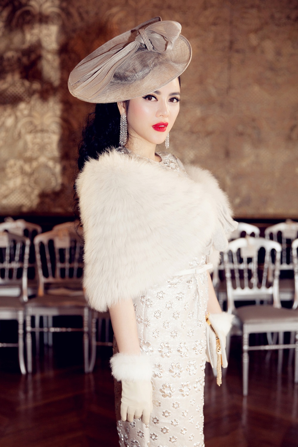 Khăn choàng lông thương hiệu Elcom Fur tô điểm cho phong cách thêm phần quý phái. Phụ kiện găng tay và chiếc nón đội to bản của thương hiệu Celine Robert cũng theo hơi hướng Hoàng gia, phối cùng rất ăn nhập.