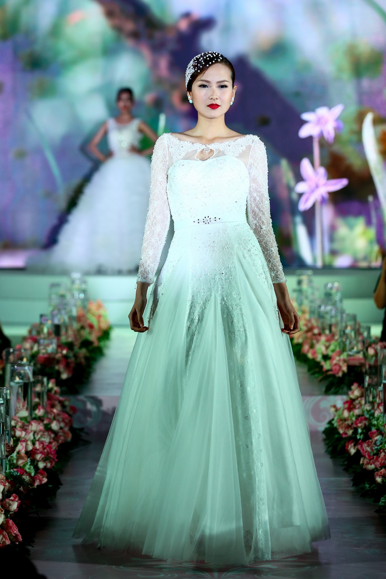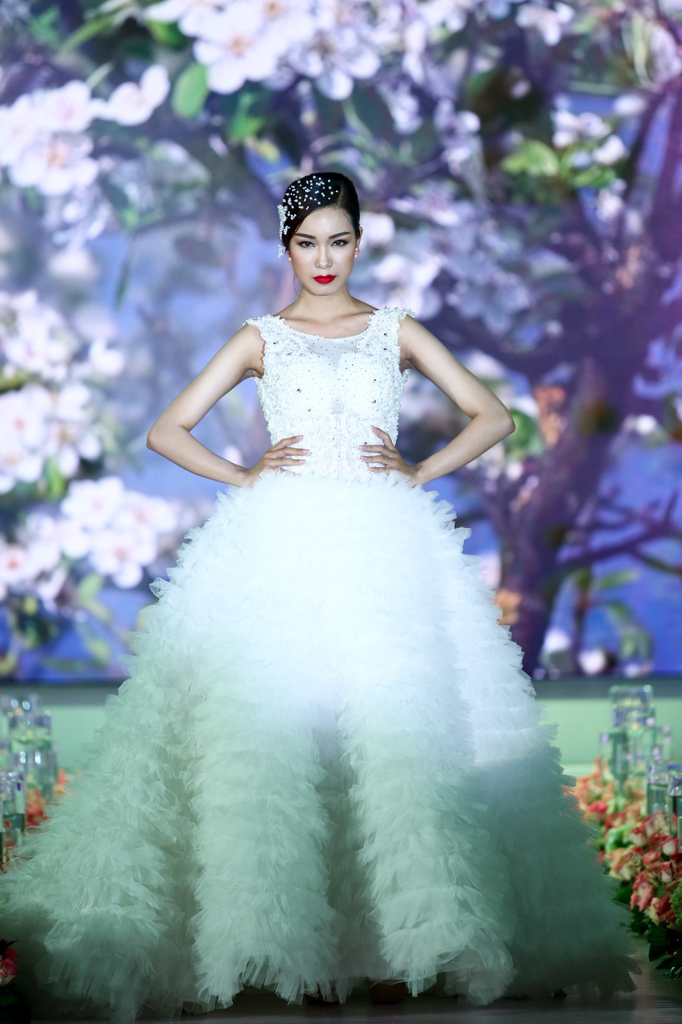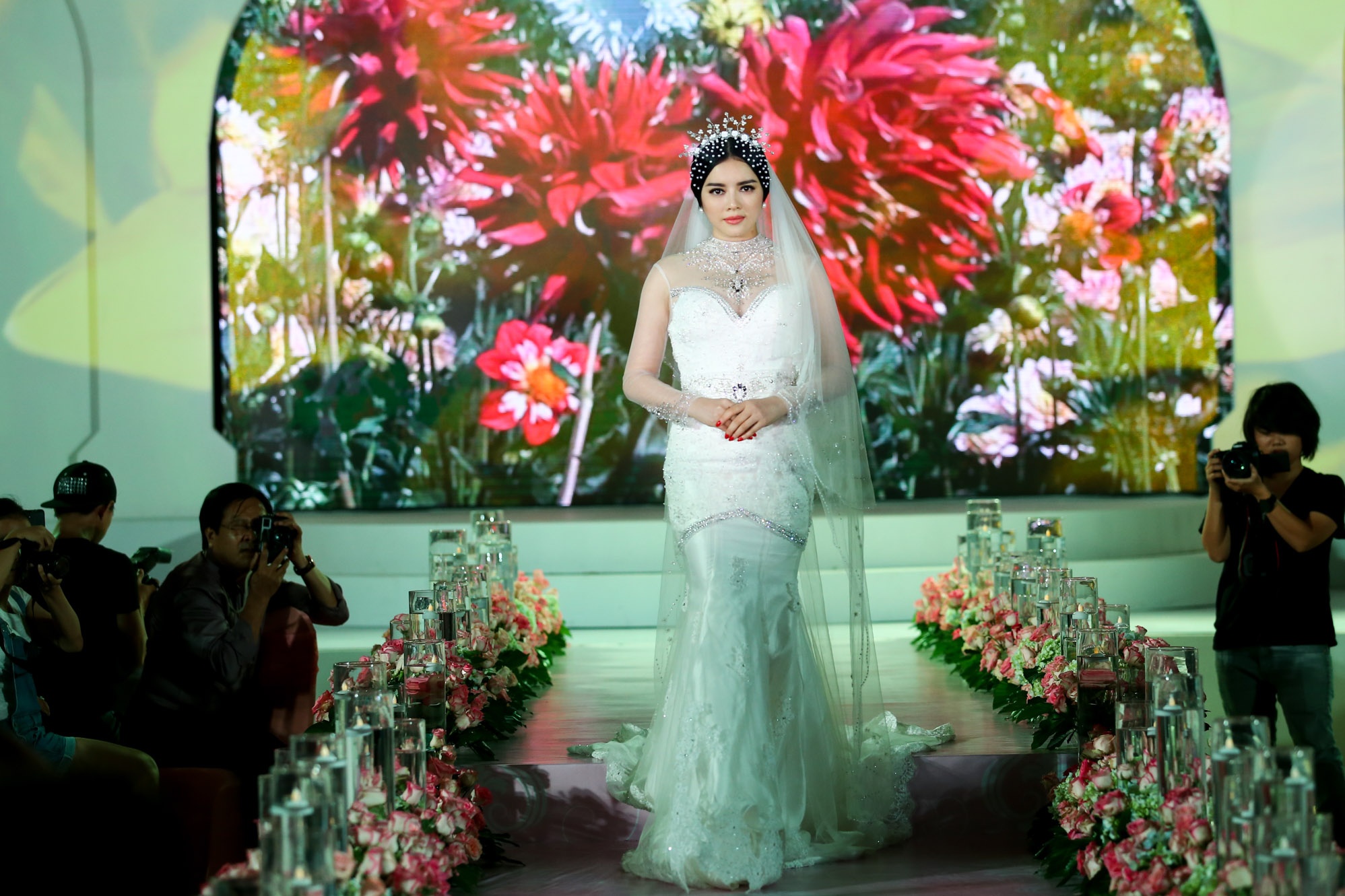 | Trong một chương trình thời trang diễn ra vào ngày 11/5, Lý Nhã Kỳ đảm nhận vai trò người mẫu thể hiện bộ sưu tập áo cưới mới nhất của chuyên gia trang điểm Minh Lộc. |