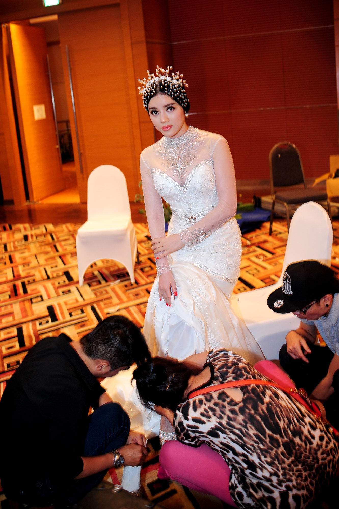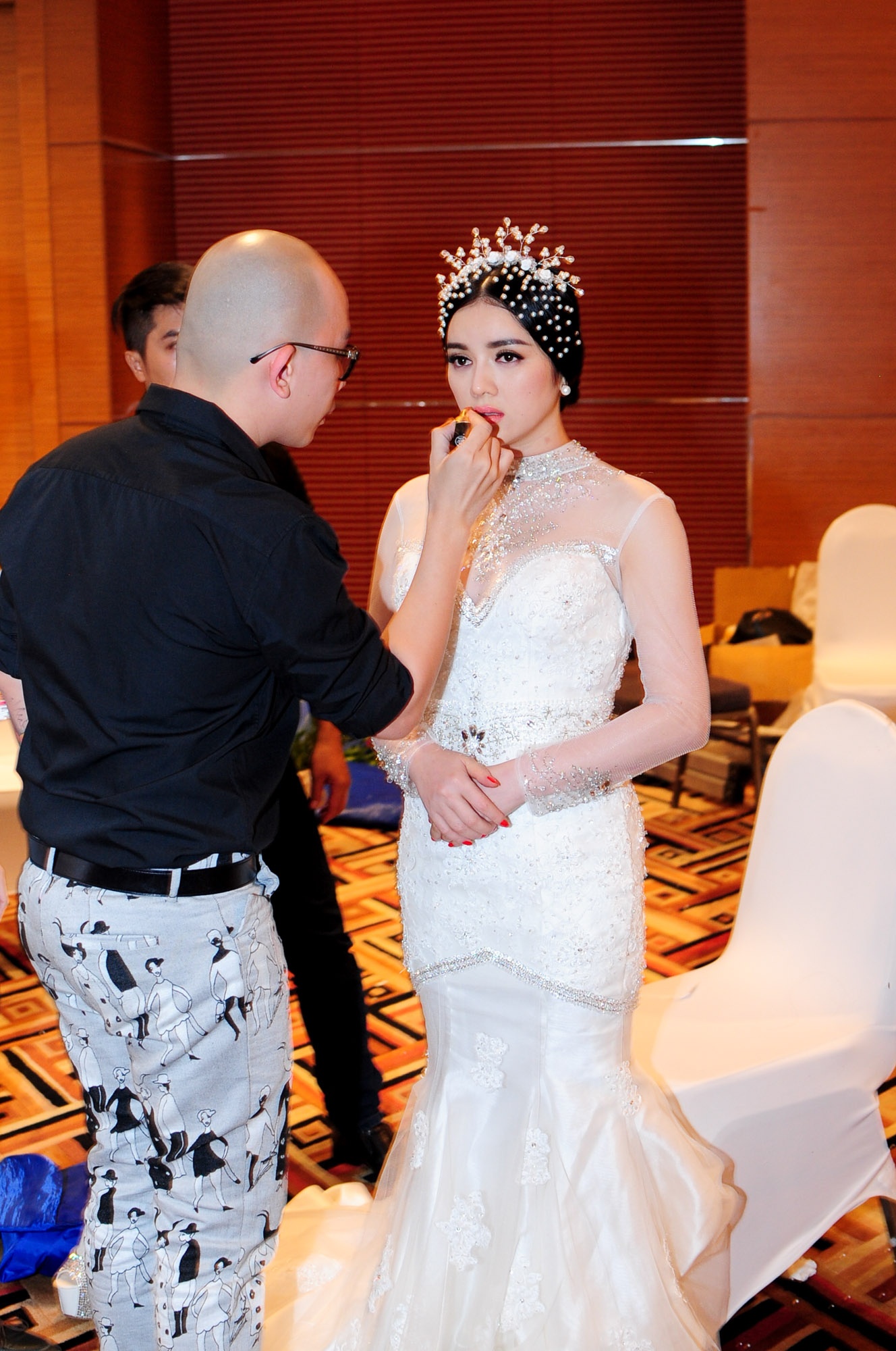 | Trước đó, phía hậu trường, Lý Nhã Lỳ được ê-kíp của mình chăm sóc khá chu đáo trước khi bước lên sàn catwalk. |