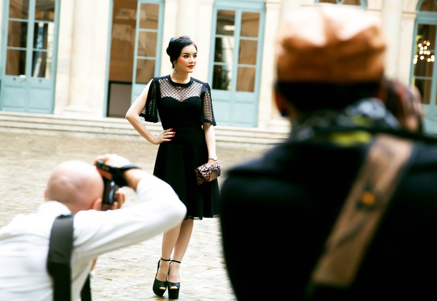 Người đẹp điện ảnh Việt thả dáng trên một con phố gần địa điểm tổ chức show diễn.
