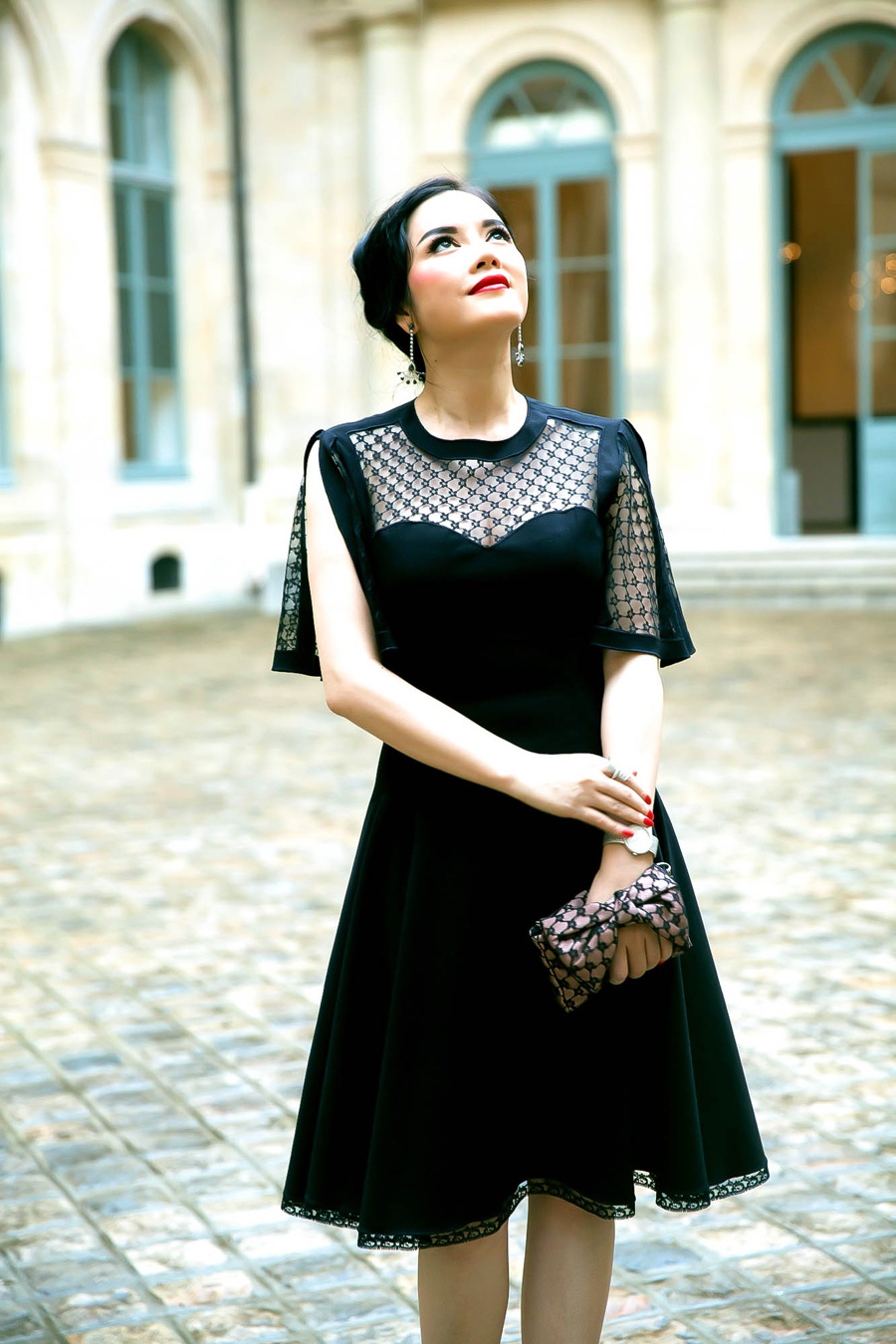 Trang phục tối màu có khoảng hở ren lưới trên thân áo phát huy hình ảnh thanh lịch của người mặc.