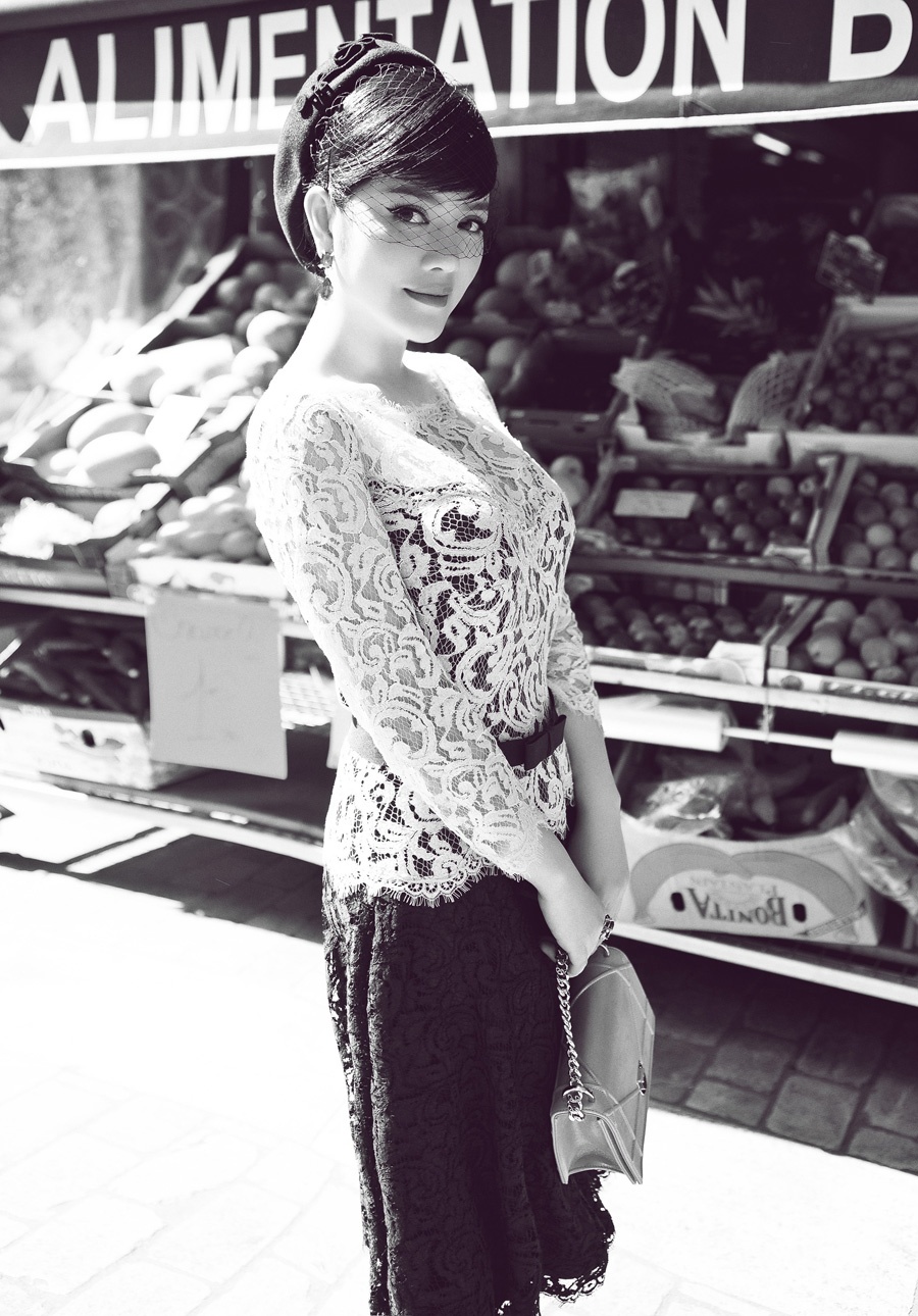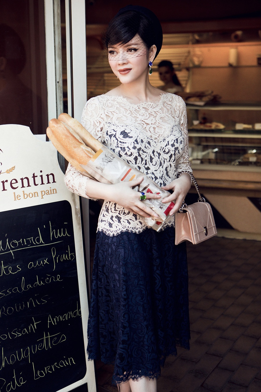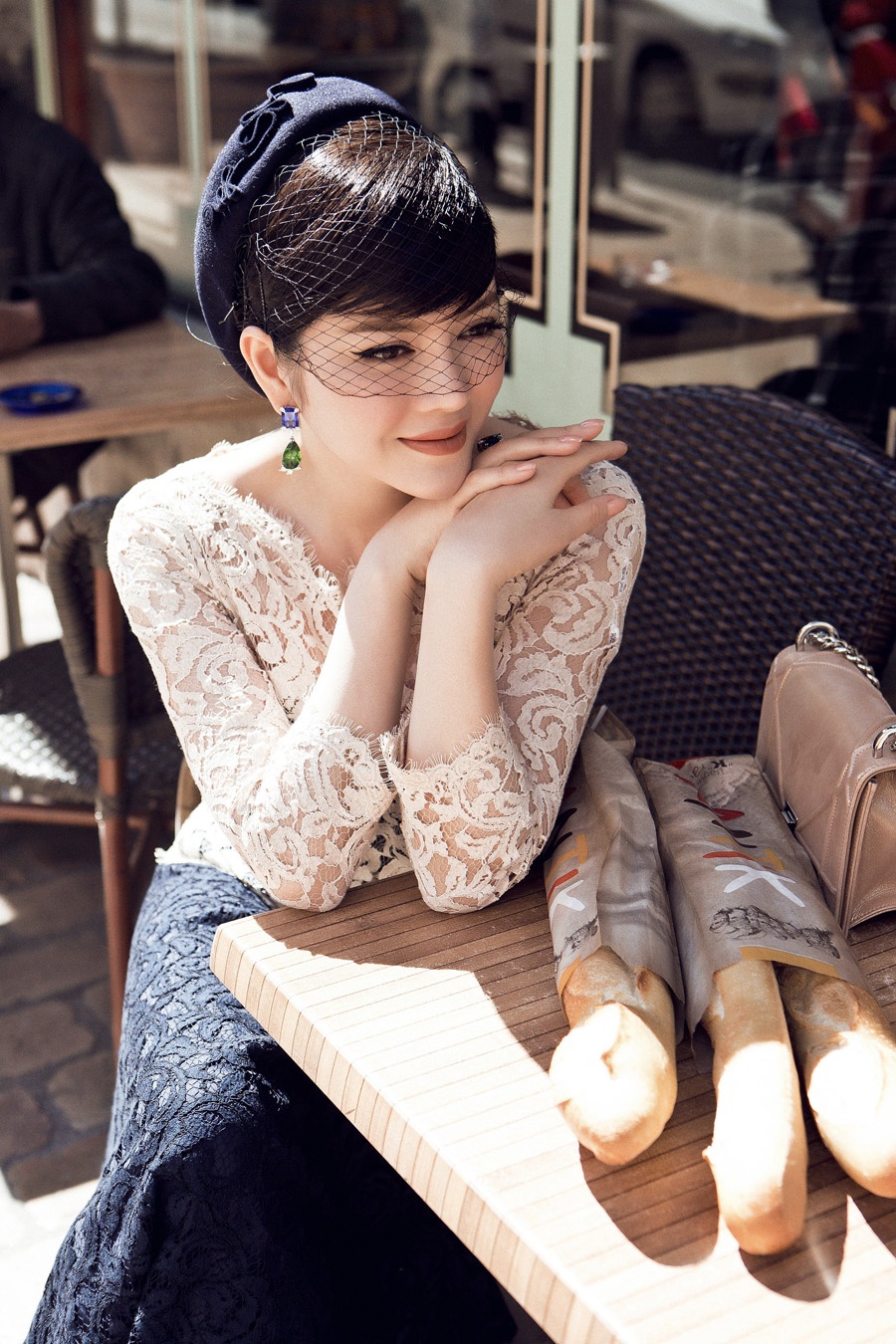 Trong bộ ảnh được chụp tại Pháp, cựu Đại sứ du lịch Việt Nam lăng xê mốt ren quý phái, trang sức sang trọng, hợp hình tượng cổ điển.