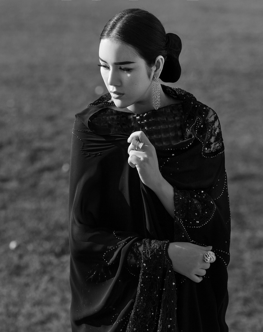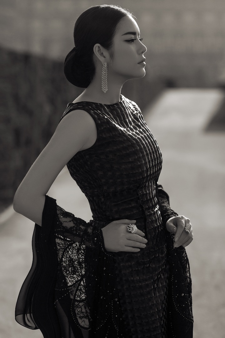 | Bộ hình do nhiếp ảnh gia Tang Tang ghi lại với nước màu đen trắng tôn nét quyến rũ tựa các quý cô ở thập niên trước. Trang phục sành điệu ăn ý cùng tông trang điểm đậm cuốn hút. |