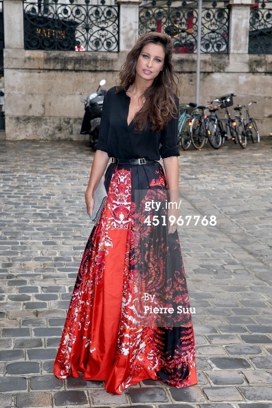 | Hoa hậu Pháp 2010 Malika Menard mix áo sơmi phá cách cùng chân váy dạ hội họa tiết nổi bật.