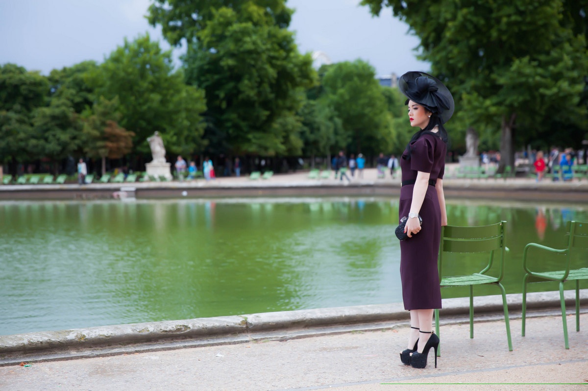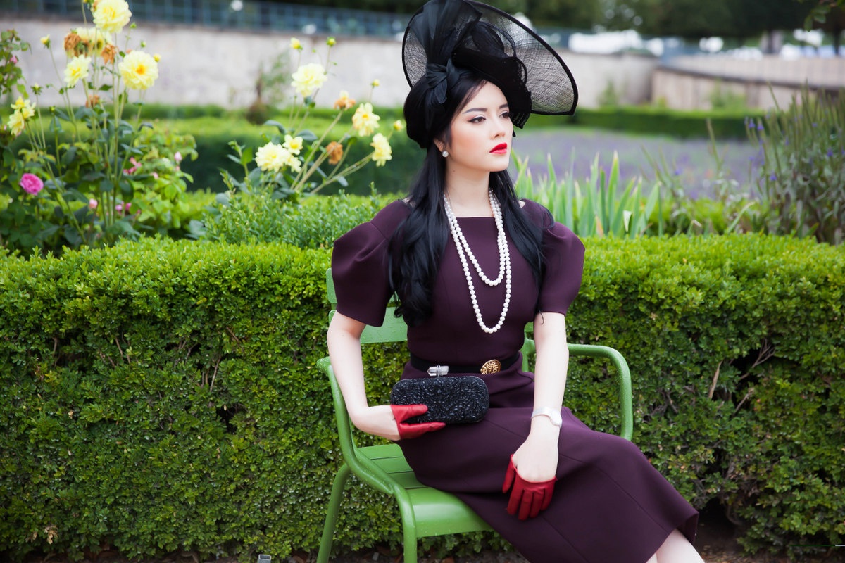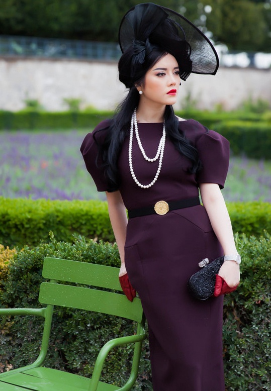 | Bộ trang phục cô chọn có gam màu tím than, phom dáng kín đáo, cánh tay bồng cổ điển, mix ăn ý cùng chiếc mũ phong cách công nương quý tộc, phụ kiện thắt lưng làm điểm nhấn và giày cao gót tôn vóc dáng kiêu sa. |