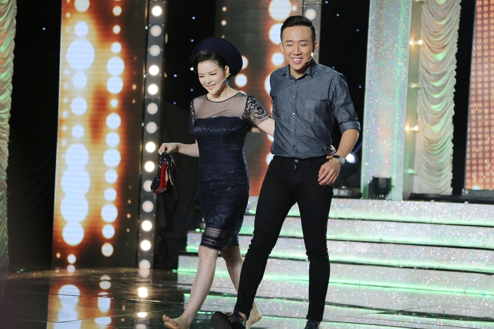 | Chị sẵn sàng tham gia thử thách của chương trình khi hóa thân thành thỏ để chú cáo Đinh Khải Anh đuổi bắt. Kiều nữ tháo luôn giày, chạy chân trần trên sân khấu. |