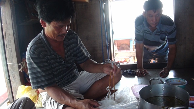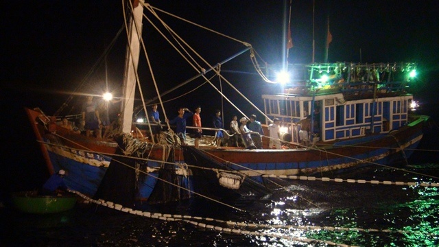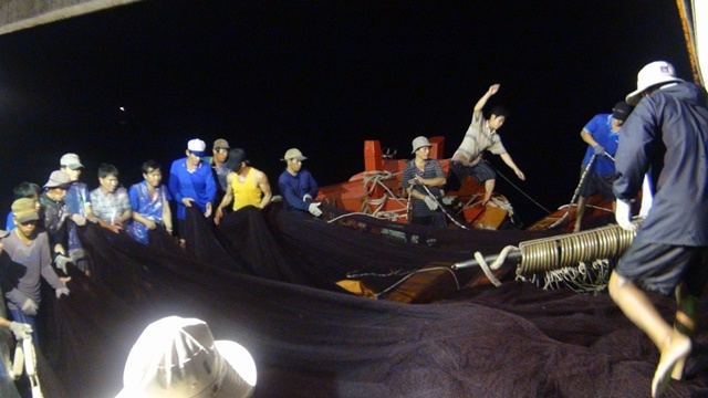 Hoàng hôn đẹp thật nhưng lúc này tôi không có lòng dạ để ngắm bởi đây là lần thứ 4 tôi ói rồi. Ra càng xa, sóng càng mạnh, tàu càng lắc, tôi cũng không chịu nổi cái dư vị này. Tôi ráng ngủ để cái bụng được yên lành. Rồi tôi bị tỉnh giấc giữa đêm đen bởi tiếng reo hò và tiếng quát tháo của chú thuyền trưởng. Mặc kệ sự ê ẩm, tôi nhảy lên nóc thuyền để quan sát và quay lại khung cảnh hoành tráng này. Những thủy thủ đang ra sức kéo chiếc lưới to bành được giăng bởi hai chiếc thuyền. Cả một vùng sáng rực ánh đèn giữa biển khơi.