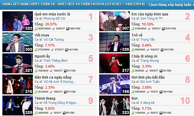 | 10 ca khúc được bình chọn nhiều nhất tuần 10 của BHYT. |