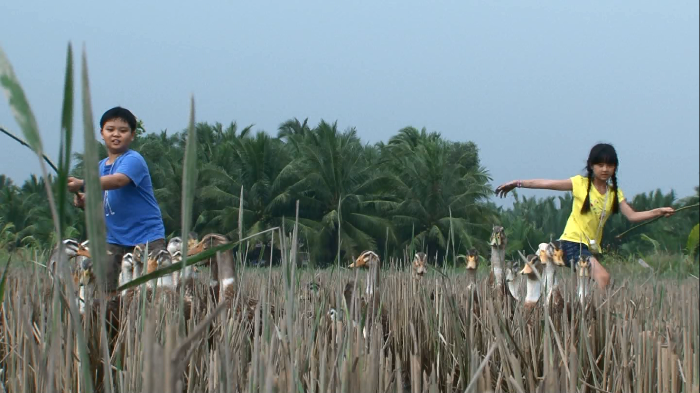 Nữ diễn viên nhí tâm sự: “Em chưa bao giờ lùa vịt. Nhiệm vụ lùa vịt không dễ. Em với bạn đối thủ hợp sức, giúp lẫn nhau nhưng bầy vịt vẫn chạy lung tung. Em chạy nhanh thì nó chạy toán loạn, em đi chậm thì không bắt kịp”.