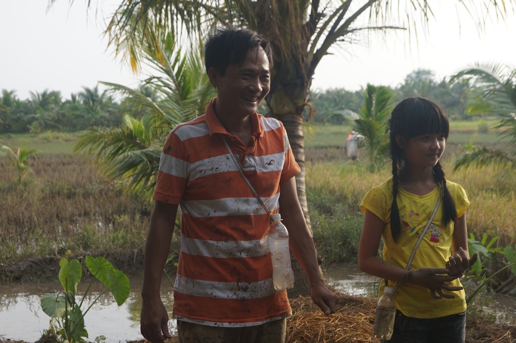 Cô bé đi rửa cá giúp cha. Ma nhí thú nhận em chưa bao giờ làm việc này ở nhà.