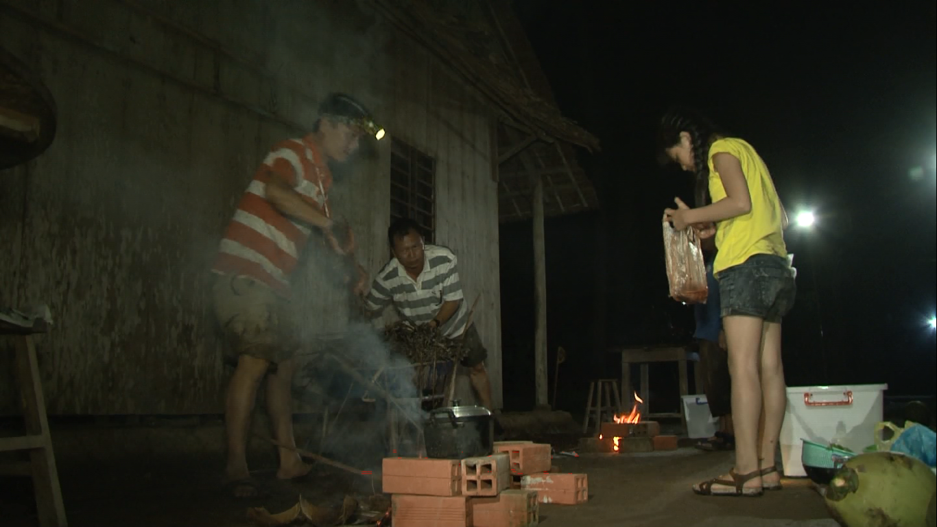 Cô bé cùng cha nấu ăn bằng bếp củi.