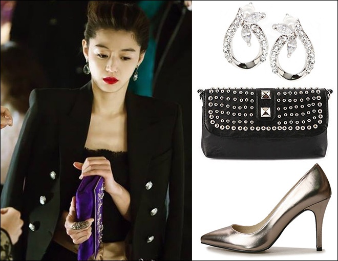 | Quý phái và sang trọng với túi cầm tay viền nút, bông tai đính đá, giày cao gót ánh kim. |