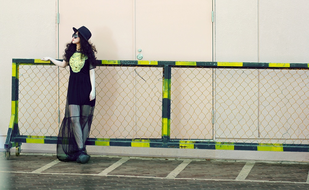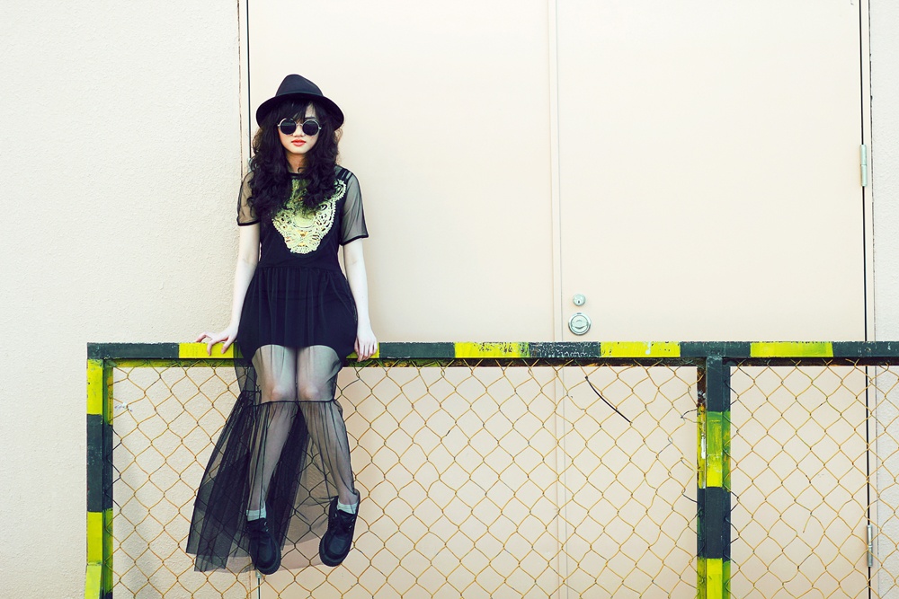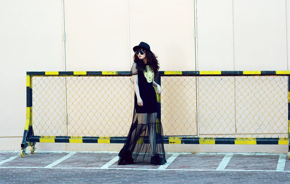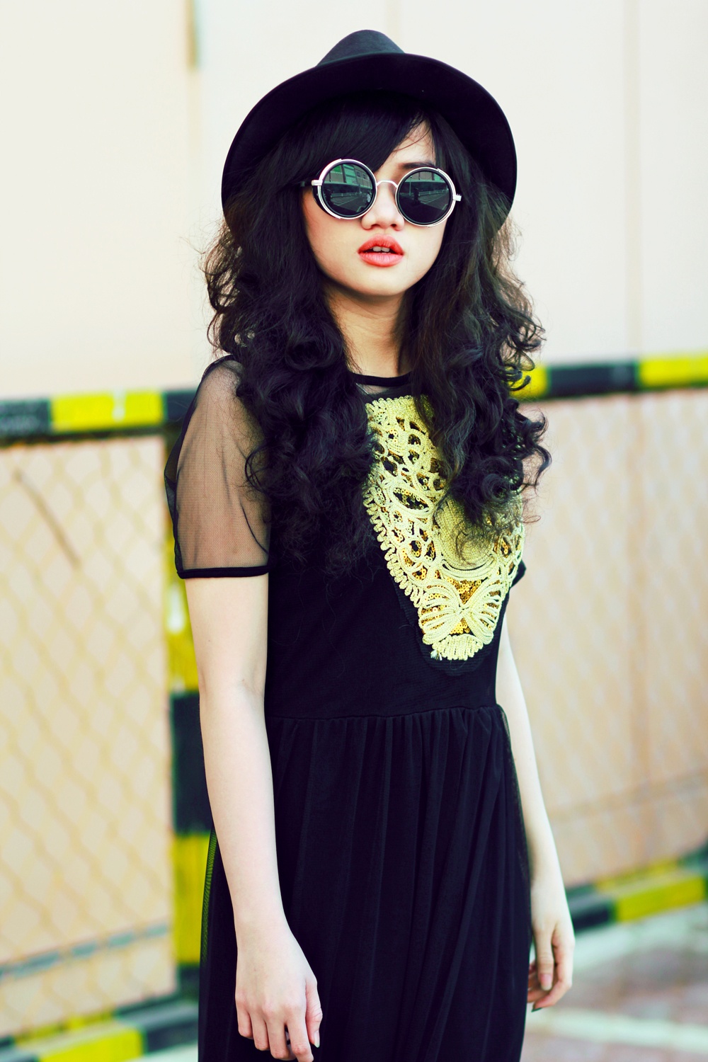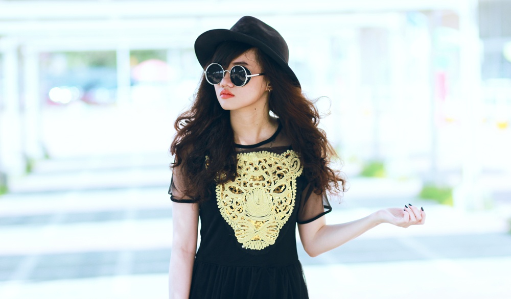 | Màu đen tiếp tục được lựa chọn để tôn nét cá tính mạnh mẽ của Hà Thư với một chiếc váy đen xuông pha sheer khác nhưng có họa tiết nổi bật. Khi kết hợp với nón fedora và phụ kiện kính mát, Hà Thư có vẻ ngoài nổi loạn, khác hẳn với hình tượng ban đầu. |