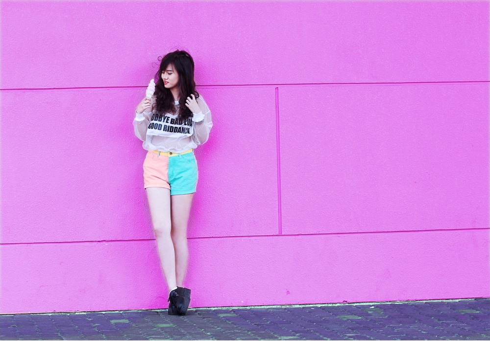 | Sheer là chất liệu không thể bỏ qua trong mùa xuân hè năm nay. Ở trang phục thứ hai, stylist kết hợp áo thun sheer xuyên thấu với quần shorts cạp cao. Trang phục tông màu pastel mang đến cho Hà Thư một vẻ ngoài tươi trẻ và đầy tự tin. |