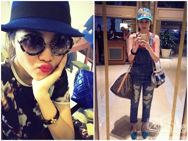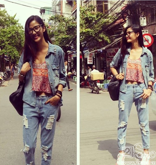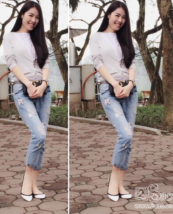 | Quế Vân khoe dáng điệu với áo kín đáo màu nhã nhặ và jeans rách, giày bệt. |