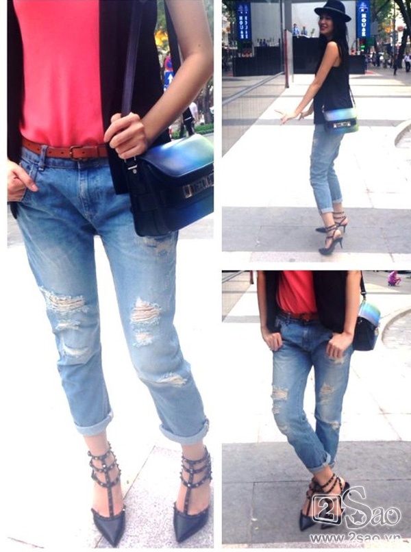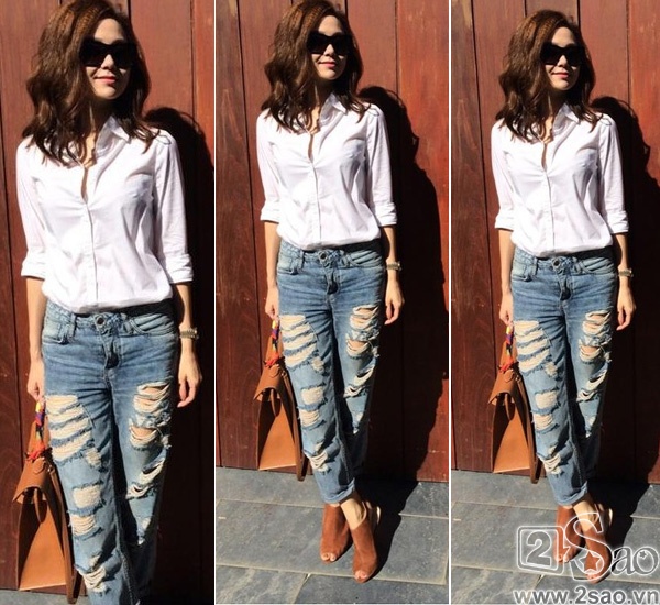 | Minh Hằng trẻ trung áo sơ mi trắng và jeans rách. Bộ phụ kiện giày, túi xách tay màu da bò cũng được khen ngợi rất ăn ý. |