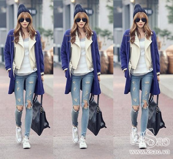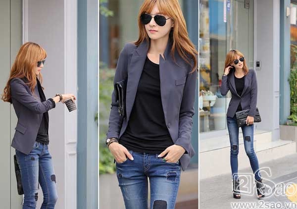 | Những ngày thu se lạnh, bạn có thể mix quần jeans rách với áo khoác dáng nhẹ như blazer, áo len dệt kim ra phố. |