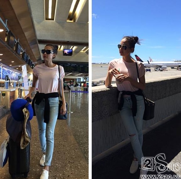 | Chỉ đơn giản quần jeans rách đầu gối cùng áo phông và áo buộc thắt lưng, trông Dương Mỹ Linh rất phong cách ở sân bay. |