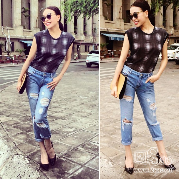 | Trà Ngọc Hằng thường xuyên "biến hóa" với street style đa dạng và jeans rách cũng là một lựa chọn của cô để khiến mình mới lạ. |
