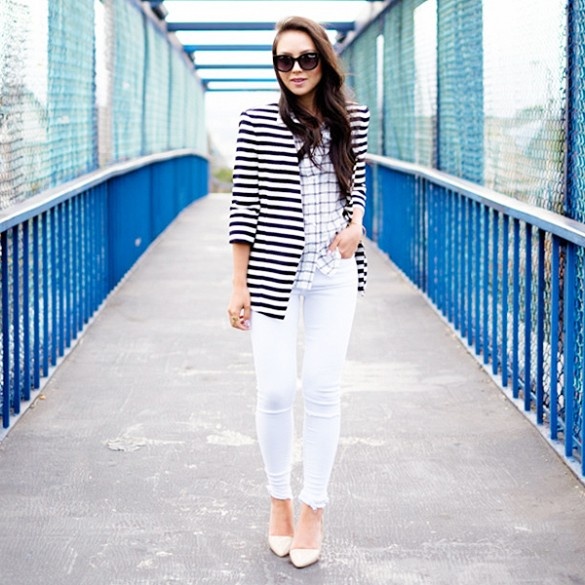 Jeans trắng mix kèm sơ mi kẻ đen trắng khỏe khoắn và giày oxford.