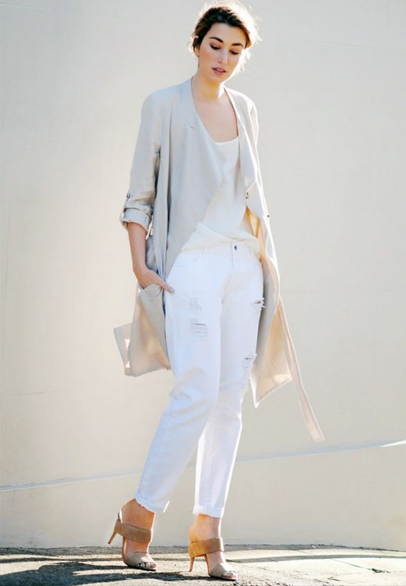 Gợi ý sang thu với áo khoác mỏng và jeans trắng.