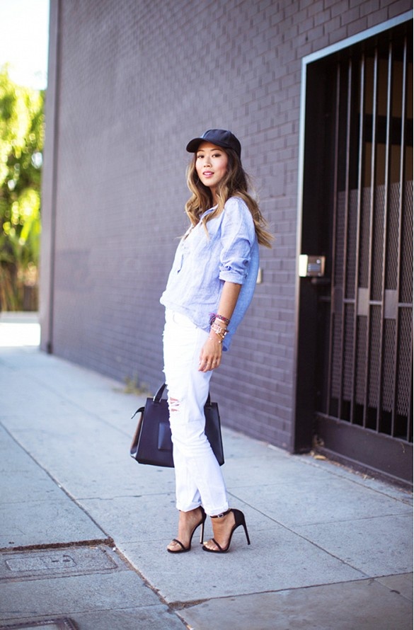 Cách mix đồ rất khỏe khoắn với jeans trắng, sơ mi, và mũ lưỡi trai.