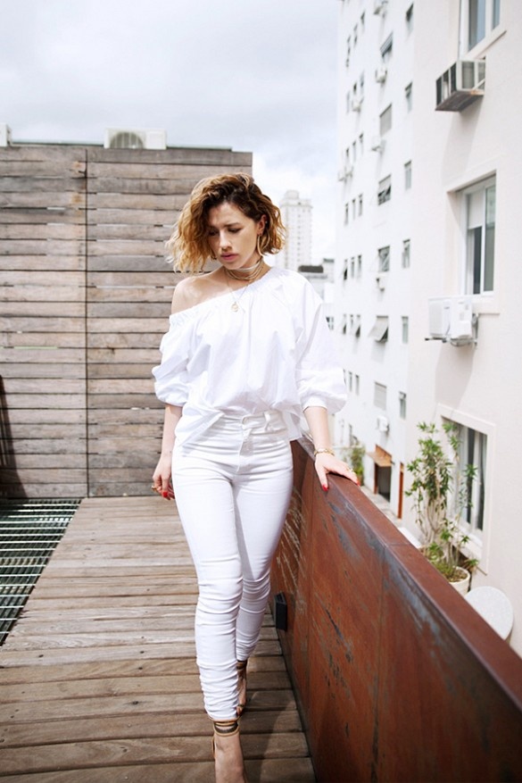 Một gợi ý cách kết hợp áo ren với jeans trắng và giày canvas khi xuống phố.