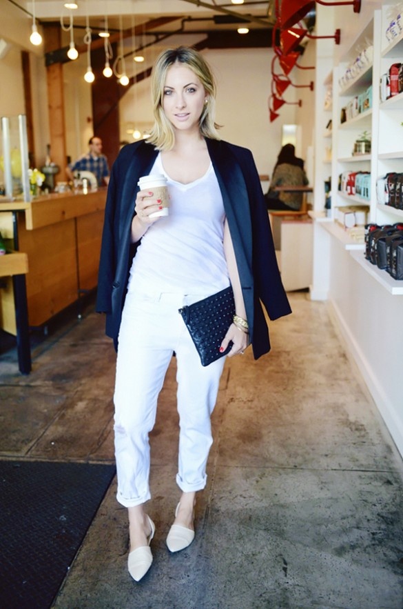 Jeans trắng đặc biệt thích hợp với cách mix đồ đen - trắng cho trang phục dạo phố.