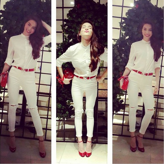 Nổi tiếng với phong cách thời trang hết sức ấn tượng, Hà Hồ cũng nhanh chóng bắt kịp xu hướng thời trang jeans trắng của các fashionista thế giới. Điểm đặc biệt là với nhược điểm vòng hông nhỏ thì kiểu quần sáng màu này sẽ giúp tạo cơ thể cân đối hơn cho cô ca sĩ xinh đẹp.