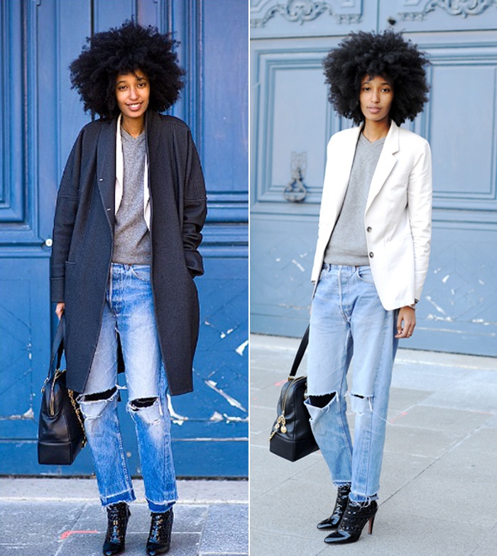 Biên tập viên Julia Sarr Jamois của tạp chí Wonderland cũng là một tín đồ của jeans rách, cô chống chọi với cái lạnh bằng việc mặc thêm quần tất đen đậm bên trong chiếc baggy boyfriend. Loại quần này vừa giúp người mặc giữ ấm mà vẫn phong cách.