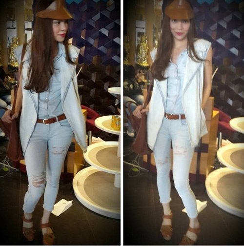 | Và Phương Thanh mix jeans rách với sơ mi |
