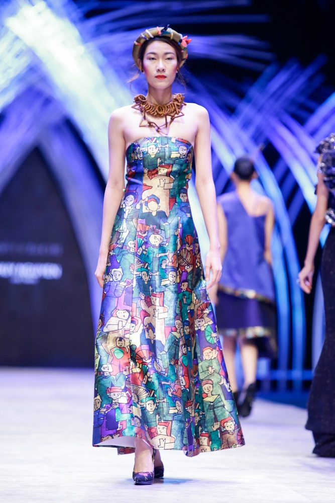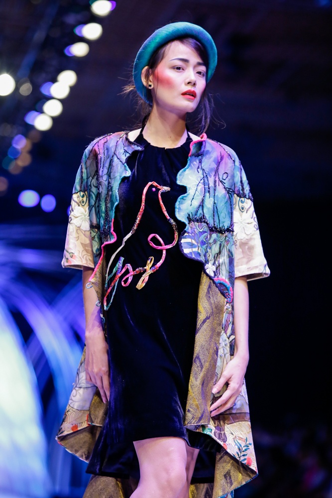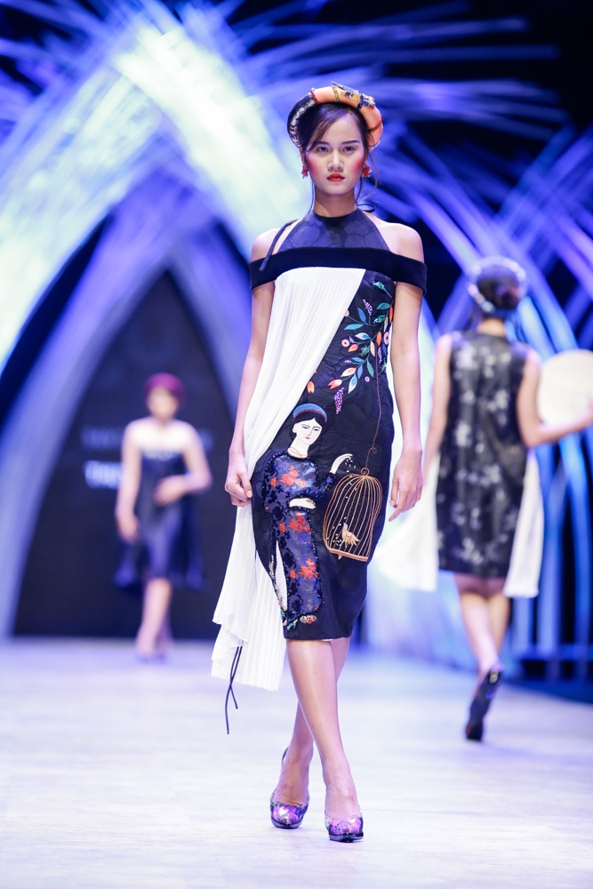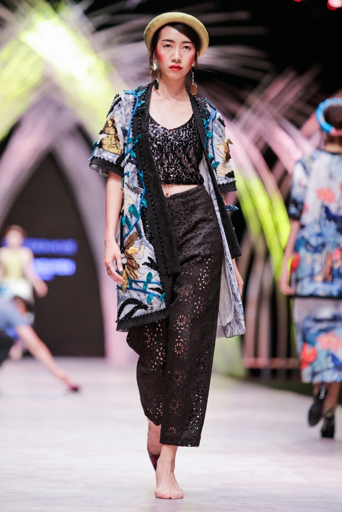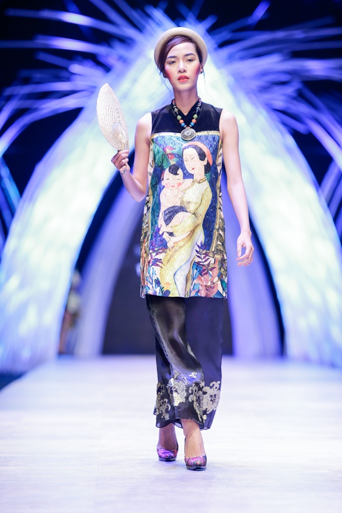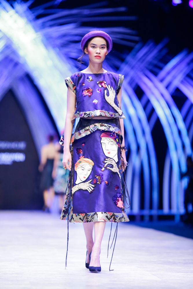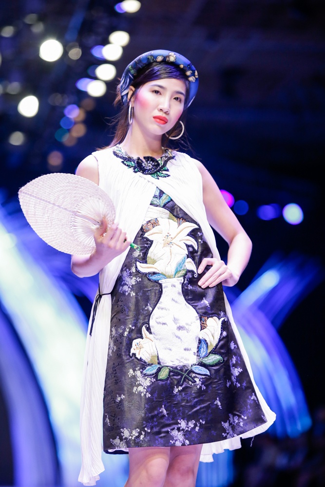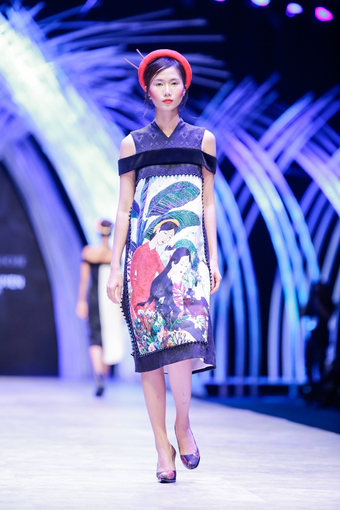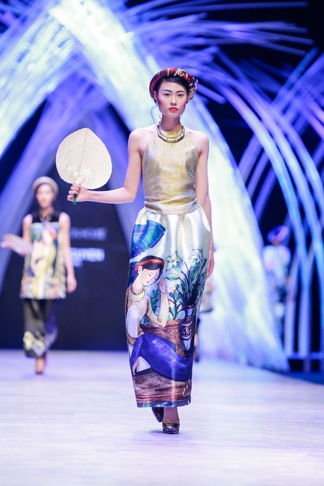 Bộ sưu tập mang tinh thần gấm, sở trường của nhà thiết kế, kết hợp kỹ thuật in cầu kỳ trên nhiều chất liệu.