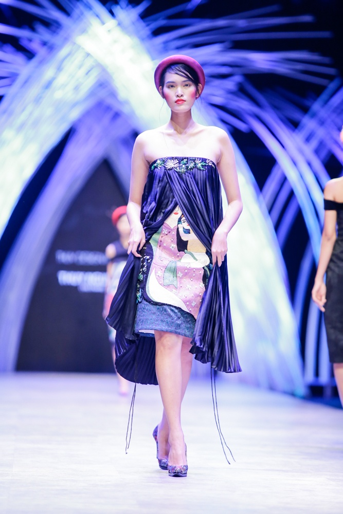 | Tối 15/10, nhà thiết kế Thủy Nguyễn giới thiệu bộ sưu tập Lúng liếng trên sàn diễn Tuần lễ thời trang quốc tế Việt Nam. Trên sàn diễn, quán quân Mai Giang diện yếm đào, kết hợp chân váy họa tiết tranh vẽ. |