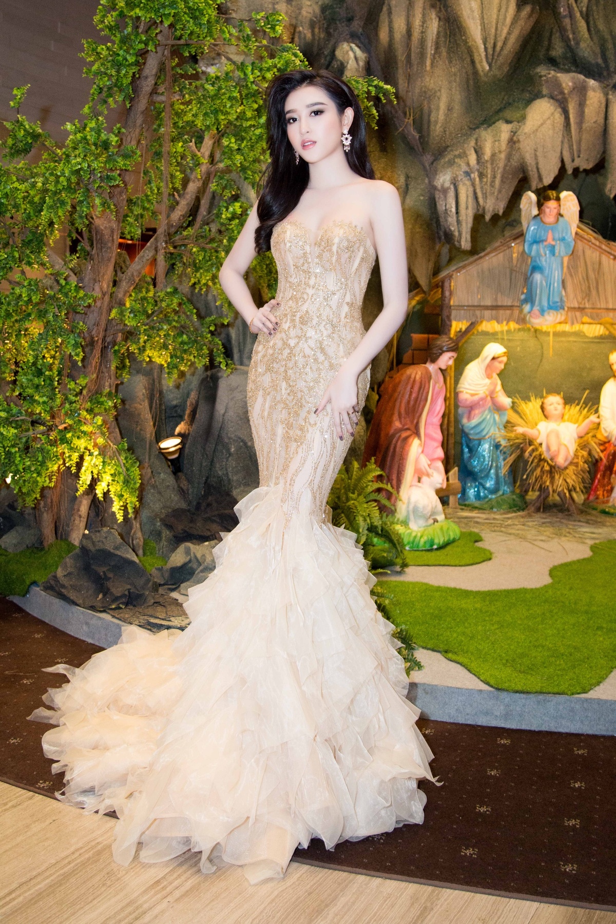 | Diện trang phục cùng chất liệu và kiểu dáng với đàn chị Thanh Hằng, song Huyền My khéo léo chọn đầm quây khoe vai trần. Thiết kế được làm từ voan kết hạt ôm trọn đường cong cơ thể á hậu. Chân váy diềm bèo tạo điểm nhấn cho tổng thể. Ảnh: Minh Luân |