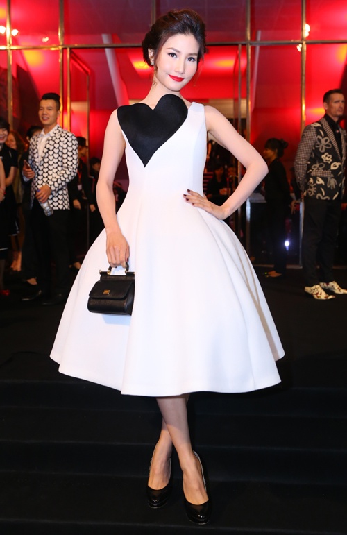 | Hoa hậu Kỳ Duyên xây dựng hình ảnh nhẹ nhàng, thanh lịch khi dự show thời trang của Đỗ Mạnh Cường. Bộ cánh tối màu điểm hoạ tiết trái tim thêu chạy dài trên thân áo tạo nét duyên dáng. Ảnh: Alec |