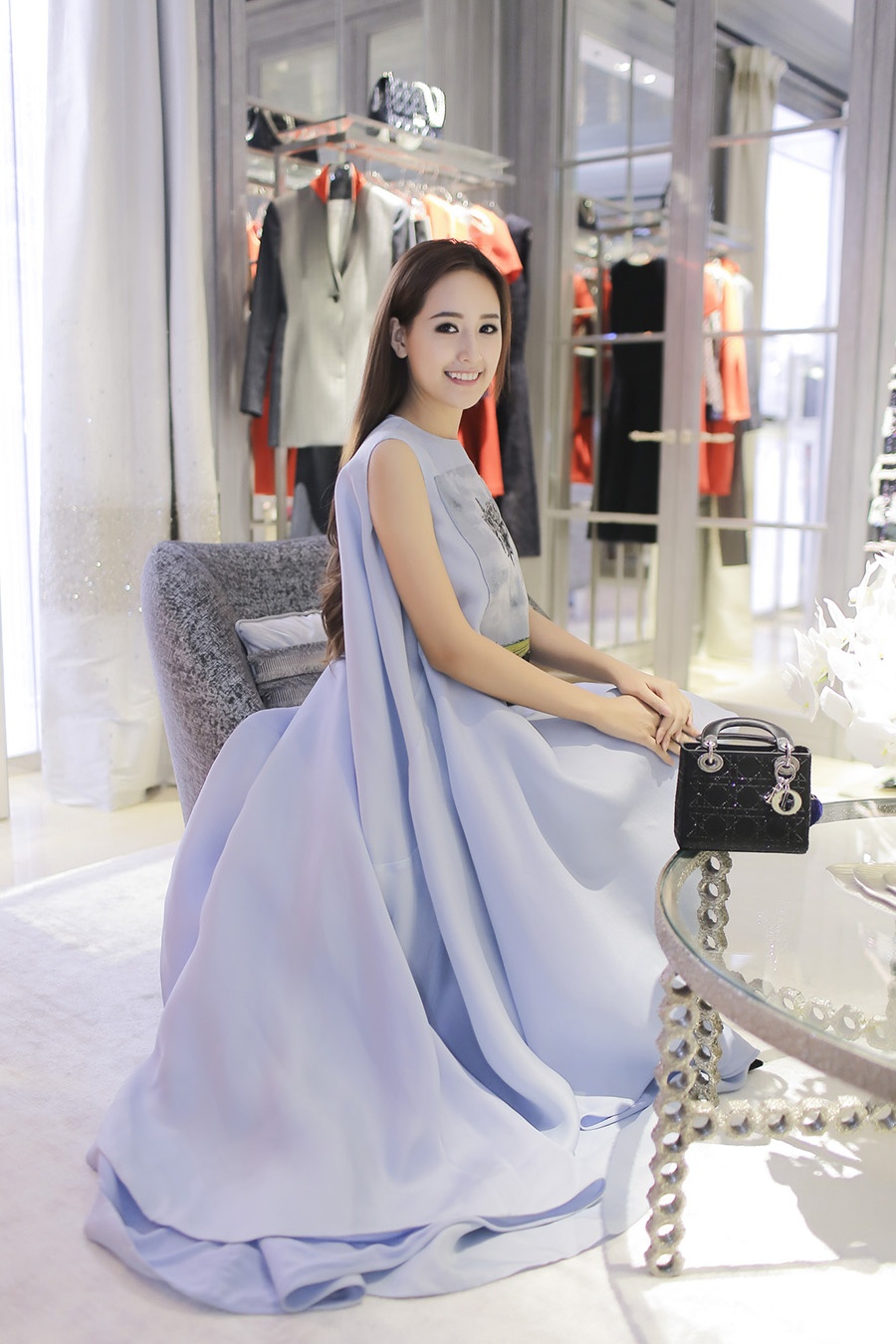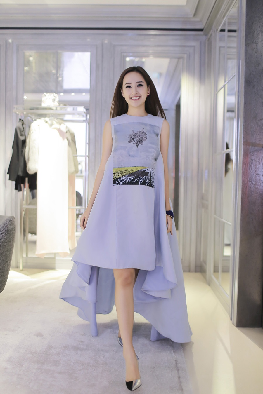 Mai Phương Thúy gây chú ý với vẻ ngoài cuốn hút. Cô diện một thiết kế thuộc BST xuân hè 2015 của Dior. Trang phục gam màu xanh pastel nhã nhặn, phù hợp với hình ảnh thanh lịch, nữ tính của hoa hậu. Bộ váy được sản xuất với số lượng giới hạn với mức giá gần 10.000 USD.