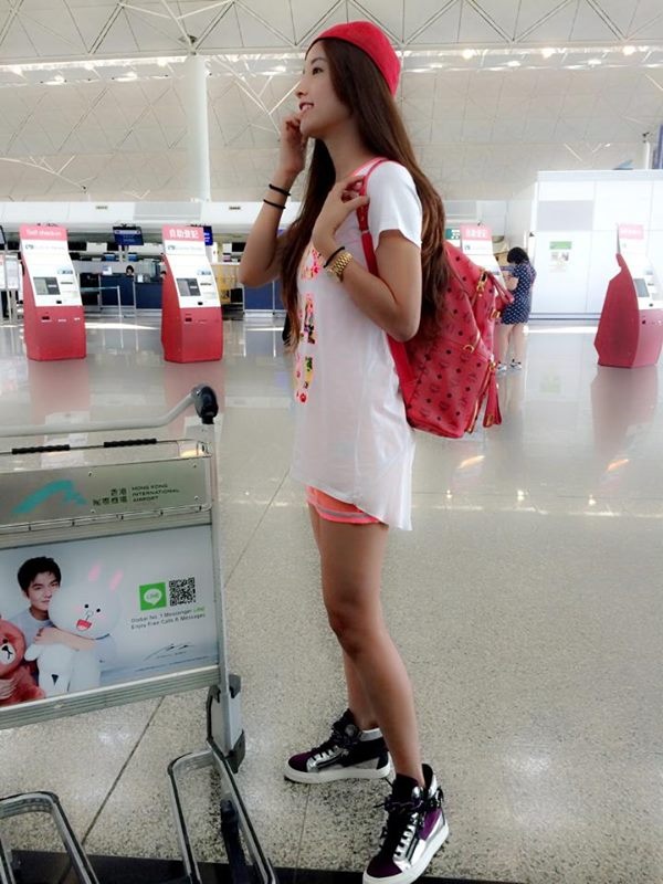 | Hình ảnh hoa hậu trẻ trung trên sân bay với mốt giày độn, áo thun và ba lô MCM hồng rực rỡ. |
