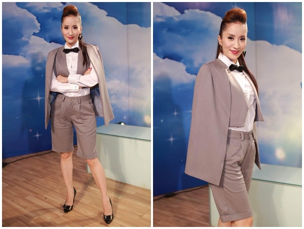 | Khánh Thi thường xuyên bị truyền thông nhắc nhở về gu thời trang rườm rà, dù vậy, nữ kiện tướng Dancesport vẫn duy trì hình ảnh kém tinh tế khi diện quần lửng ngồi "ghế nóng" chương trình Bước nhảy hoàn vũ 2015. |