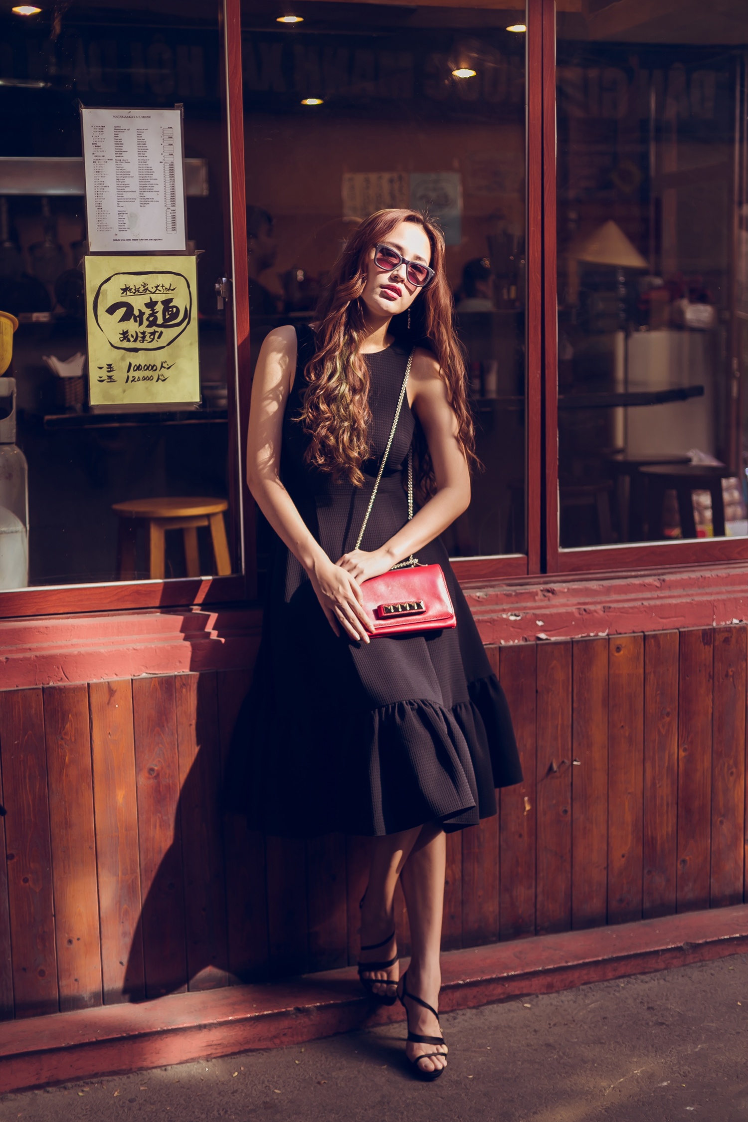 Vừa trở về từ chuyến công tác tại Hong Kong, người đẹp sinh năm 1988 bắt tay vào việc xây dựng hình tượng thời trang đường phố. Trong ảnh, hoa hậu diện đầm đen dáng suông nữ tính.